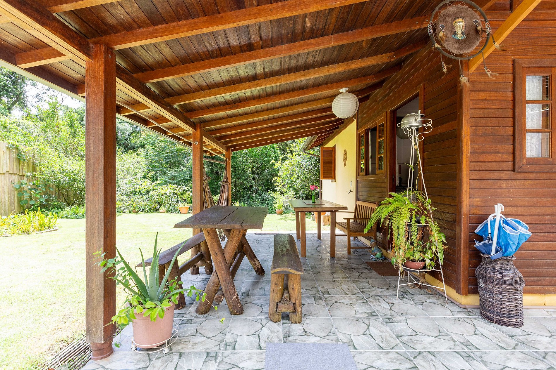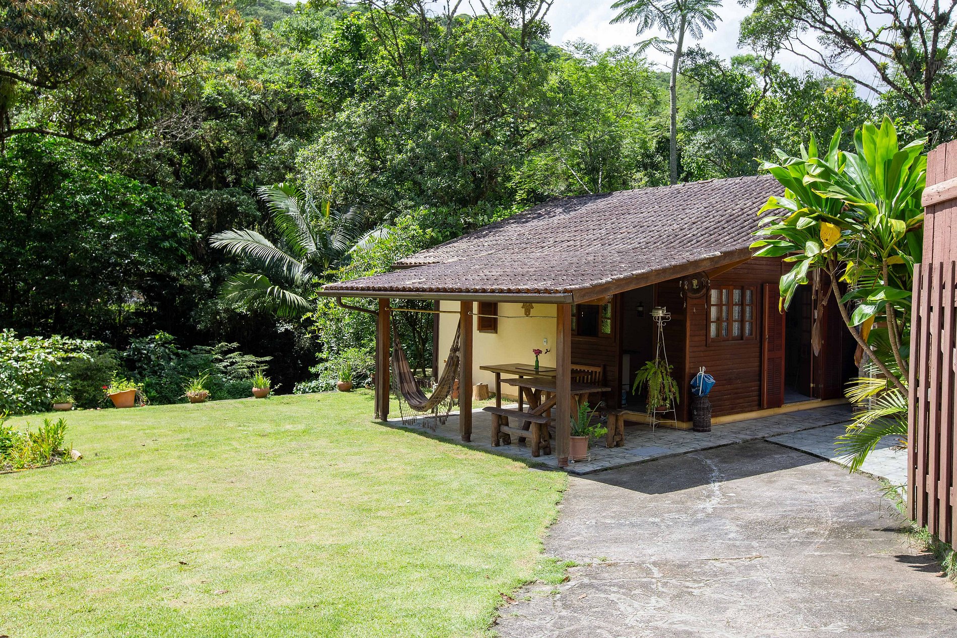 A casa principal é composta por varandas e móveis externos para apreciar os sons da cachoeira e dos pássaros locais.