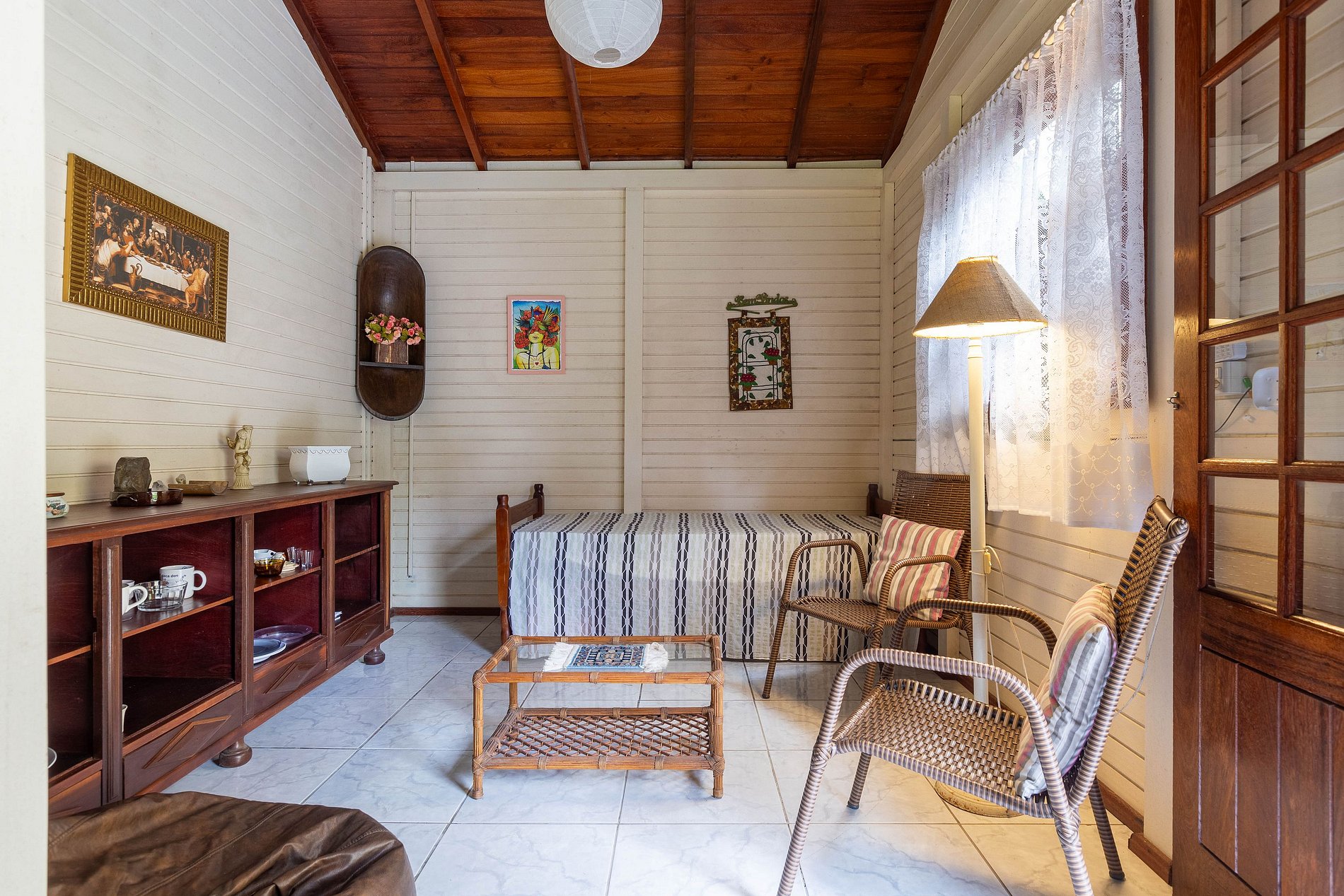 A cozinha possui itens necessários, como airfryer, micro-ondas, geladeira pequena, cafeteira, chaleira elétrica, torradeira, garrafa térmica, fogão, mesa redonda com cadeiras e bancos, sala integrada com a cozinha e vista para o jardim, sofá de 3 lugares, puff, bancos, cristaleira, abajour para aconchegar o ambiente e aquecedor elétrico portátil. O quarto principal (casal) possui aquecedor elétrico portátil,ventilador, espelho, armário, cabideiro vertical, banco aos pés da cama e janela com vista para a mata. O banheiro da propriedade é amplo e com vista para a cachoeira, com chuveiro elétrico e cortina de plástico, bem arejado e com acesso à varanda nos fundos da casa. Na edícula temos dois quartos privados com acesso pelos corredores laterais e a lavanderia. O quarto duplo é arejado e preparado com - duas camas de solteiro com mesa de trabalho, cabideiro vertical, luminária e aquecedor elétrico portátil. Quarto triplo com um espaço aconchegante e iluminado, com uma cama de casal ,um sofá cama e luz natural que mantém o ambiente fresco e ventilado. O quarto conta com uma mesinha prática com tomada, ideal para pequenos momentos de trabalho ou descanso. Dois bancos rústicos complementam a decoração, enquanto o espelho e uma arara para casacos oferecem funcionalidade e charme ao ambiente, tornando-o perfeito para quem busca conforto e praticidade durante a estadia.