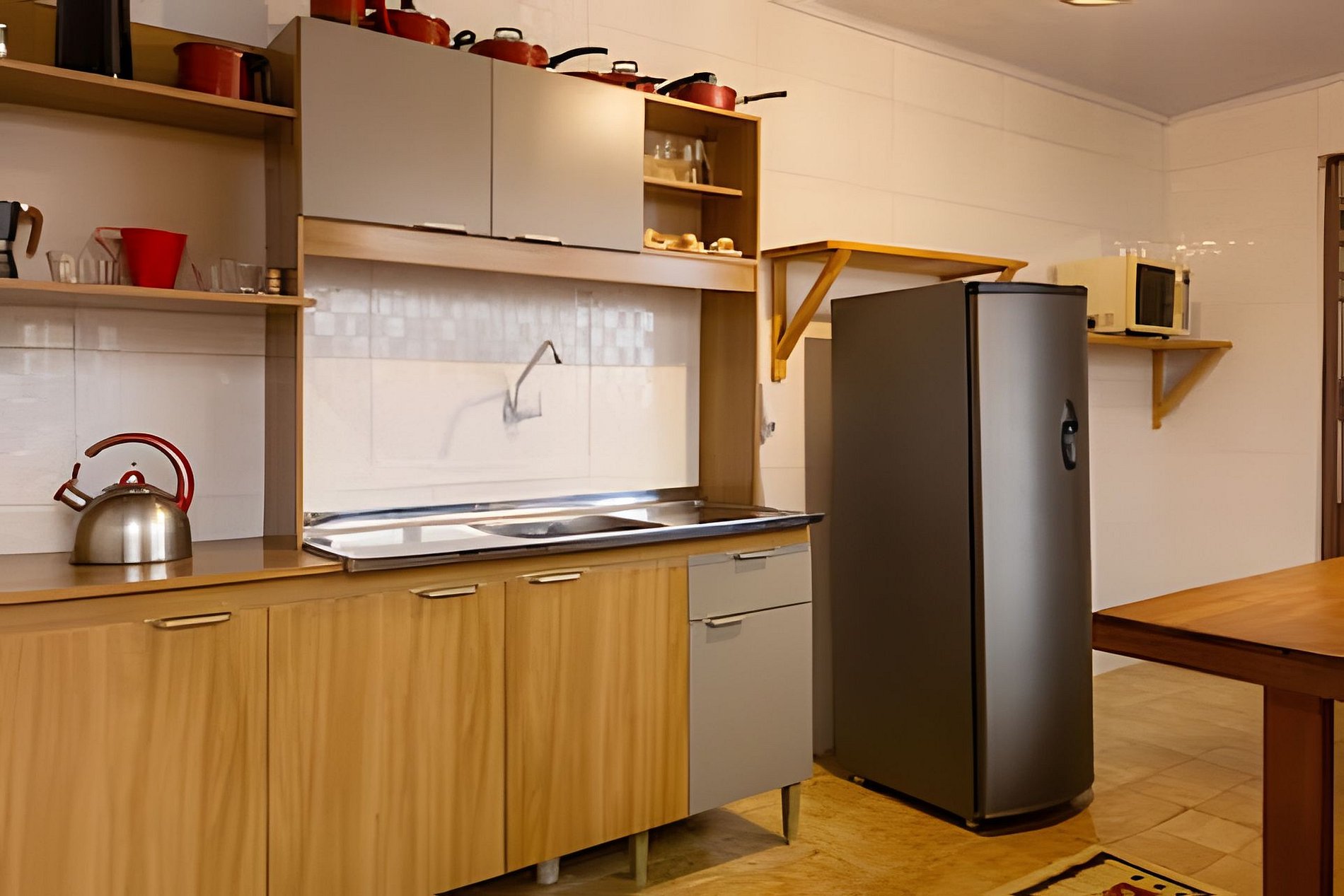 **Cozinha:** Equipamentos básicos, incluindo geladeira, cafeteira, chaleira elétrica, liquidificador, micro-ondas e fogão a gás.