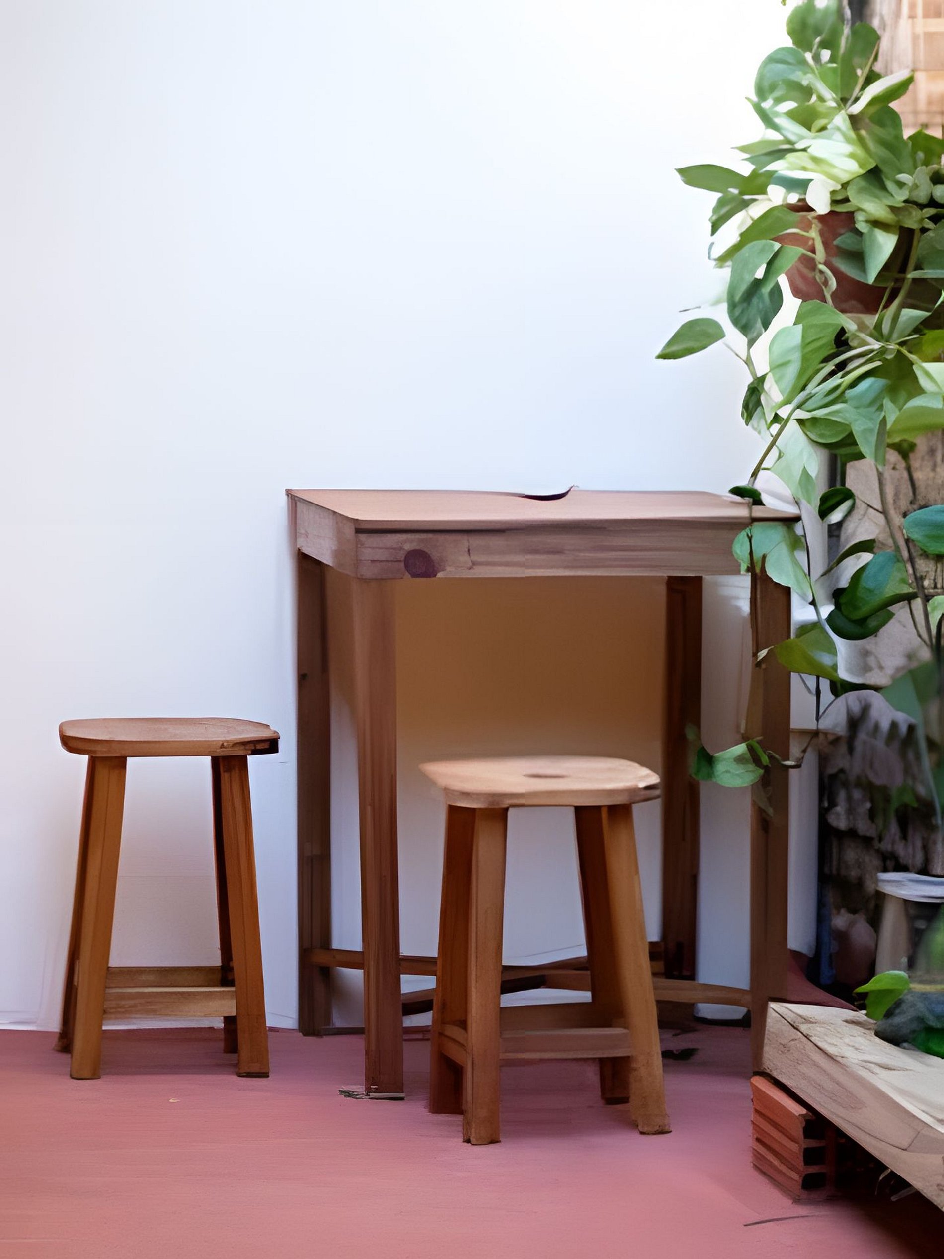 **Área Externa:** Mesa e banco, plantas e acesso coberto aos banheiros.