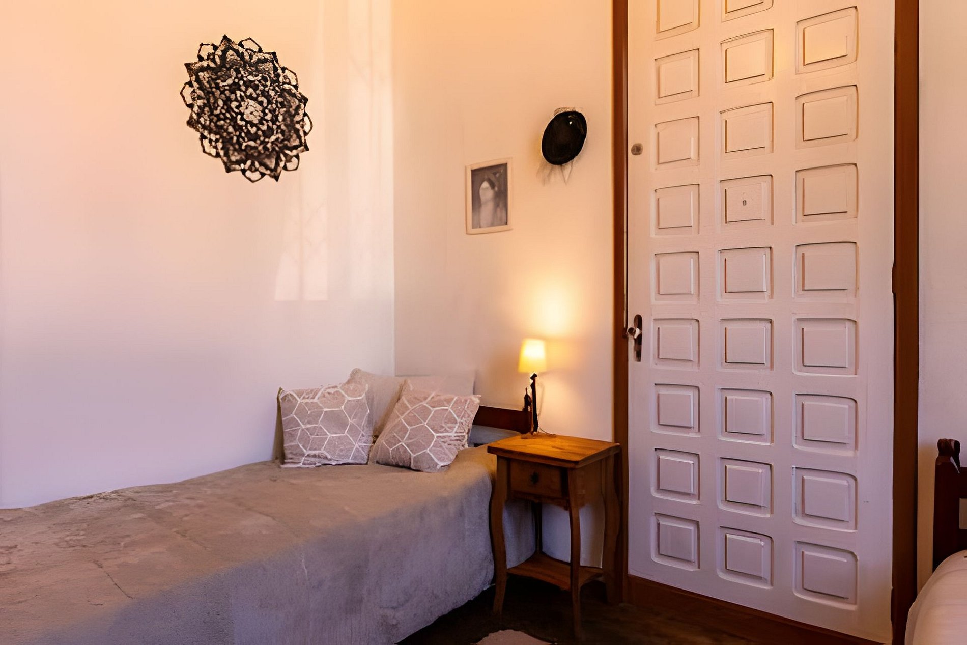 **Quarto Duplo:** Duas camas de solteiro, móveis rústicos, parede original histórica, abajur, cabideiro e armário. Acesso à varanda privativa pelo Acesso 1.
