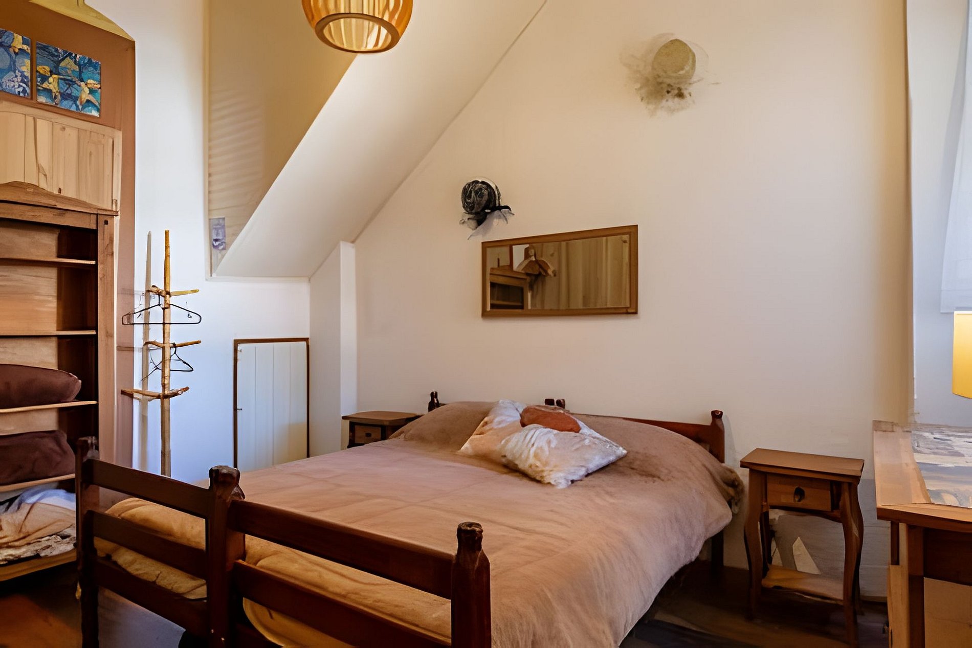 **Quarto Casal:** Cama queen em estilo rústico, móveis em madeira, roupas de cama completa e boa iluminação natural.